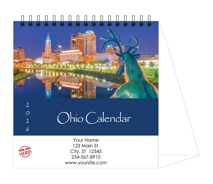 Desktop calendars with easel are printed on premium cover weight stock and bound with a strong wire-o binding that offers a straight alignment with the tent easel. Eco-friendly by printing on both sides, front cover - June then turn calendar around and finish the year. The calendar grid is a minimalist style with large font to view easily at your desk. Our 2026 photo gallery miniaturized in the corner and a quote that will catch your attention. The extended area on the easel behind the calendar displays your custom details in full color.